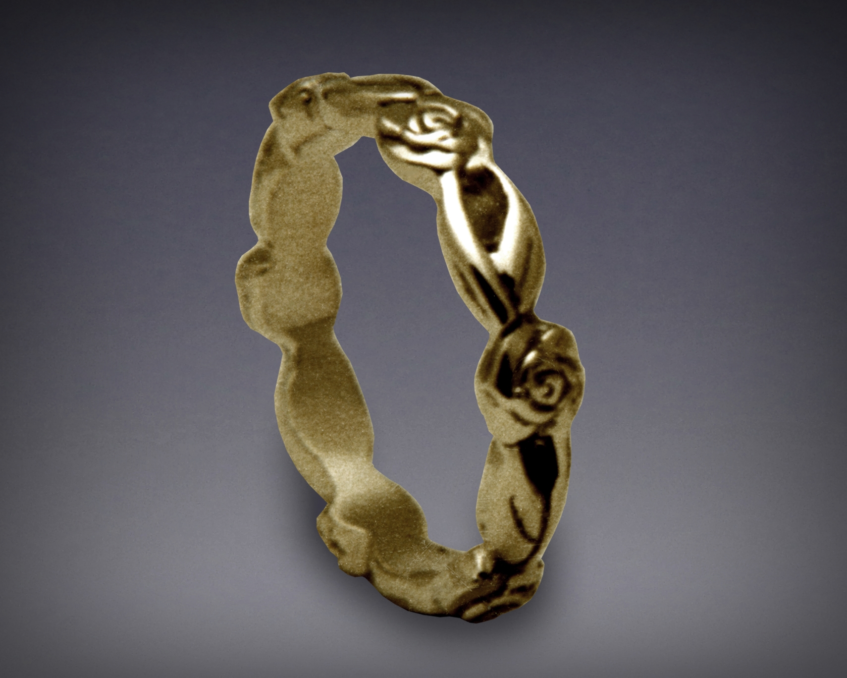 $395.0014k Gold Ring ( 3.75 grams ) ( 5/32″ wide ) with an arrangement of interactive Roses and Leaves .